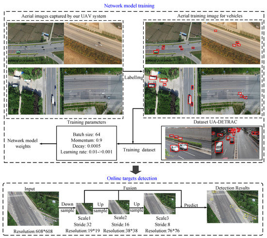 As shown in Figure 3, target detection is divided into the network-model-training and online-target-detection stages. Since the weights provided by the official YOLOv3 website are not good for the detection of small-sized vehicles in airborne videos, we needed to use self-built datasets to train new network-model weights for vehicle detection in aerial images. First, we used our UAV system to collect a large number of aerial images, including a variety of traffic scenes, some of which are shown in Figure 3. The UAV system is composed of a DJI-MATRICE 100 and a monocular point gray camera. Aiming at vehicle targets in aerial images, we utilized LabelImg [31] to generate 5000 annotation files of aerial images; the labeled aerial images are shown in Figure 3. Due to the different UAV shooting angles and heights, vehicle appearance and sizee in these images are various and the background is complex, so that the model they train can have good generalization for new aerial videos. In addition, we supplemented the training dataset with public dataset UA-DETRAC [32]. The dataset had 10,900 images that were captured by a fixed surveillance camera with a high erection height. The vehicle size in these images was medium, similar to aerial images taken by UAVs at low altitude. Based on this training dataset, we chose a YOLOv3 network model for training. The network model included YOLOv3-608, YOLOv3-416, and YOLOv3-302. These models had 106 network layers, but normalized size and speed were different in image processing. Considering the speed and detection effect, we chose to train the YOLOv3-608 network model and obtain the weights. In the process of training, we used a batch size of 64, 0.9 momentum, and 0.0005 decay. The batch size represented the number of sample per batch, which depends on GPU memory. Momentum in the optimization method can affect the speed of gradient descent. Decay is the parameter of weight attenuation that can prevent overfitting. Moreover, we set the initial learning rate, the step of gradient decent, as 0.01, which could rapidly reduce los. Then we changed the learning rate to 0.001 to precisely obtain optimized network-model weights.