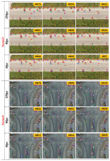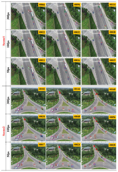 Figure 6 and Figure 7 shows the tracking results at three different frame rates in Scenes 1 and 2. Scene 1 was an intersection and Scene 2 was a highway triangular turntable, and the three frame rates were 30, 10, and 5 fps, respectively. Figure 8 displays the tracking results at three different frame rates in Scenes 3 and 4. Scene 3 was a busy road and Scene 4 was a crosroad, and the three frame rates were 25, 8, and 4 fps. In these scenarios, there were many targets, such as in Scene 1, and the background was complex. There were many trees, solar street lights, and some buildings, such as in Scenes 1 and 2. Target movement was also complicated, for example, stationary, straight driving, turning a corner, turning back, and target size varied greatly.