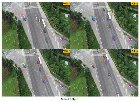 The aerial images in test dataset were collected by our UAV system at altitudes of 50 to 60 m, which included four kinds of surveillance scenarios and multiple video frame rates. Specifically, the test images were divided into four groups according to the scenarios, intersection, highway triangular turntable, busy road, and crosroad, as shown in Figure 5c. In these scenarios, the number of vehicles was large, the motion of vehicles was complex, such as straight running and turning, and the size of vehicles varied greatly, which greatly challenged the object-tracking algorithm. Each group of images contained more than 8000 images with a resolution of , including three different frame rates. The video frame rates of Scenes 1 and 2 were 30, 10, and 5 fps, respectively, and the video frame rates of Scenes 3 and 4 were 25, 8, and 4 fps, respectively. Each group of images can be used to test the tracking performance and robustness of the algorithm at different frame rates. At present, we posted this dataset on a website: https://frank804.github.io/.