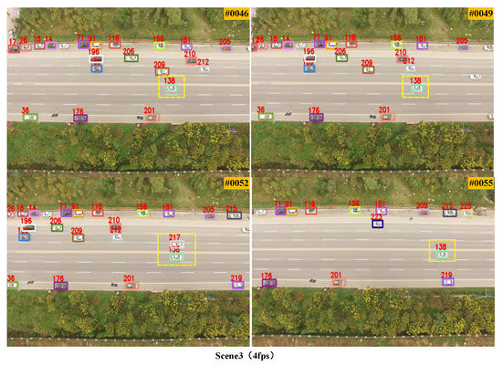 Despite many difficulties, the proposed tracking method still yielded good results. The results are shown in Figure 6 and Figure 8. For example, (1) the proposed algorithm was able to track targets well in both straight and curved roads at an arbitrary frame rate. Such as Target 13 in Scene 1 of Figure 6, the black vehicle moving in a straight line at 30 fps, Target 14 at 10 fps, Target 15 at 5 fps; Target 39 in Scene 2 of Figure 6, the white vehicle moving along the curve at 30 fps, Target 26 at 10 fps, and Target 23 at 5 fps. (2) Small targets could be tracked correctly, such as Target 2, Target 54 in 30 fps, Target 2, Target 32 in 10 fps, and Target 2, and Target 30 in 5 fps in Scene 2 of Figure 6. (3) The detection and tracking of stationary targets was effective, such as Targets 92, 102, 141 at 25, 8, and 4 fps, respectively, in Scene 3 of Figure 8. (4) At a vehicle-intensive city intersection, the vehicle’s turning and U-turn movements were also likely to cause target tracking to be lost from the curve. Our algorithm can also achieve good tracking results. Such as Target 61 at 4 fps in Scene 4 of Figure 8. (5) The proposed tracking algorithm also worked well for predictive tracking by optical-flow-trajectory voting, such as Target 0 at 25 fps, Target 3 at 8 fps, and Target 1 at 4 fps in Scene 4 of Figure 8. (6) Object adhesion caused by moving vehicles with closer movement, which is very easy to misjudge two targets as one. Such as Target 217 in Scene 3 of Figure 9. However, our tracking algorithm could track them very well by using the optical-flow voting method.