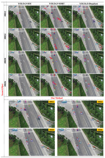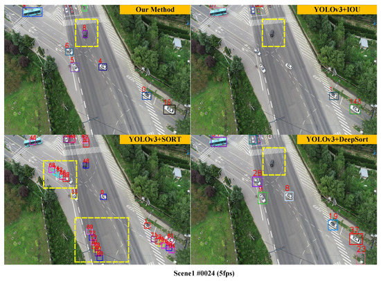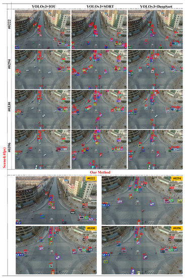 In this section, we outline qualitative and quantitative comparison experiments with three state-of-art tracking algorithms to further evaluate the performance of the proposed multiple-tracking algorithm. These three tracking method were YOLOv3 + IOU [24], YOLOv3 + SORT [21], and YOLOv3 + DeepSort [22], respectively. We selected two scenarios from test dataset for the experiment, Scenes 1 and 4, respectively. Scene 1 was an intersection with complex background and vehicle movement. Scene 4 was a crosroad, there were many vehicles in the scene, and the motion of the target was complicated.