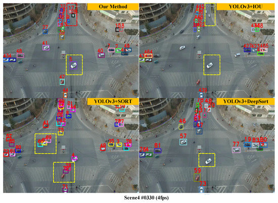 Tracking results of this algorithm and three other tracking algorithms in Scene 4, YOLOv3 + IOU, YOLOv3 + SORT, and YOLOv3 + DeepSort. Scene 4 was a crosroad, there were many vehicles in the scene, and the motion of the target was complicated. The video frame rate of the experimental images was 5 fps.