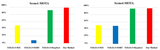 Histogram of tracking-performance parameter MOTA of four tracking methods. The MOTA of: YOLOv3 + IOU in Scenes 1 and 4 was 98.94% and 97.56%, YOLOv3 + SORT in Scenes 1 and 4 was 98.94% and 97.56%, and YOLOv3 + DeepSort in Scenes 1 and 4 was 98.94% and 97.56%. The MOTA of our method was 98.94% and 97.56% in Scenes 1 and 4, which was better than the three other algorithms.