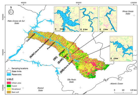 São Paulo State and the map of the Tietê River Cascade System (TRCS) with land use and land cover (LULC) of the Tietê basin (reservoirs, forest, shrubland, bare soil and urban areas by ‘Coordenadoria de Planejamento Ambiental da Secretaria de Meio Ambiente’—CPLA, 2010). Four sampled reservoirs are magnified where sampling locations are indicated.