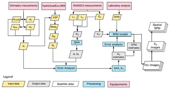 Integration of volume scattering function (VSF) retrieved the backscattering coefficients from HydroScat-6P (HobiLabs, Bellevue-USA) and ECOBB-9 (WetLabs, Philomath-USA) measurements []. EcoBB-9 was used after the calibration process, whilst HydroScat-6P did not have such information. The absorption correction was made using laboratory measurements, and exponential fitting was applied to standardize the wavelengths to be in accordance with the outputs from the QAA. A flowchart showing the methodology described in this section is given in Figure 2.