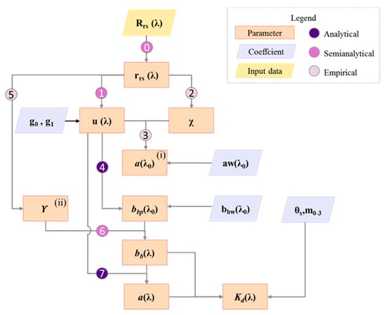 Kd were estimated using IOPs obtained from QAA modeling through the seven steps (Figure 3). Version 5 of the QAA (v5, []) has been empirically calibrated in coastal waters, where at(55x) might be less than 0.5 m−1. Broader applications for inland water require several site-specific adaptations, mainly in the empirical steps [,,]. The main error sources are related to (i) the reference wavelength (λ0) and the estimations of absorption coefficient and (ii) the spectral power slope (Υ) used to compute bb [,,]. Furthermore, the empirical steps in the QAA also depend on the location of the sampled dataset []. The former limitation implies that re-parameterization of the coefficients is necessary because the optical conditions of water are distinct from the original study sites.