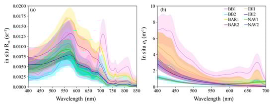 The in situ dataset of Rrs, as well as the total absorption curves, are shown in Figure 4. Different magnitudes through the Rrs spectra are largely caused by the varying concentration of OSCs. The green (500‒600 nm) and NIR bands (>700 nm) are the ranges most sensitive to SPM. A high level of CDOM displaces the 550 nm-Rrs peak toward 600 nm, as observed during the field surveys in BAR and IBI. Furthermore, higher Chl-a concentrations contribute to the high absorption in the blue range (Table S2) as observed in BB1, BB2 and BAR1 (Figure 4b). A marked peak of Rrs near 550 nm is correlated with the relatively high SPM concentrations. A smaller peak around 650 nm in some curves also indicates the presence of phycocyanin, caused by the absorption feature near 620 nm [] and 670 nm, due to Chl-a.