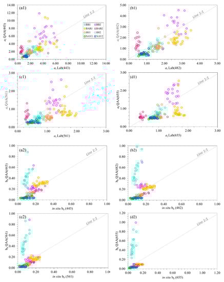 IOPs derived from QAAQ—a(λ) with index 1 and bb(λ) with index 2. The frames represent the center wavelengths of OLI bands (a) 443, (b) 482, (c) 561 and (d) 655 nm.