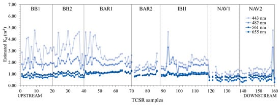 Since the QAATRCS derived at and bb with the lowest errors (Table 7), these outputs were used in Equation (1) to retrieve Kd. The estimated Kd over each of the central wavelengths of OLI are shown in Figure 6, presenting a wide range of variability and a generally decreasing trend downstream. The Kd(443) ranged between 0.69 and 4.78 m−1 with a coefficient of variation (CV) near 43%, while Kd(655) ranged between 0.64 and 1.2 m−1, with CV = 16%.
