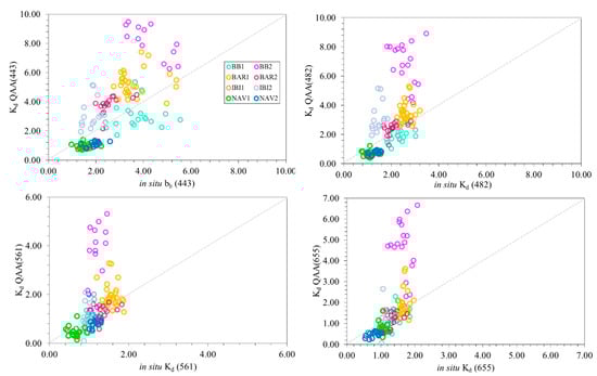 Outputs of QAATRCS were used in the Kd equation (Equation (1)). The model published by Lee et al. (2013) derives Kd from IOPs and is considered a semi-analytical model which provides reliable estimates for inland waters according to Gomes et al. (2018) []. When comparing Kd_QAA and Kd_r, resulting errors were less than 25% for the entire TRCS’s dataset, with the minimum at 561 nm (19.2%). The poorest performances were found in BB2, BAR1 and BAR2, which could be affected by the complexity of water types—the presence of relatively high concentrations of OSCs variably impacts the light attenuation and consequently produces higher values of Kd that were not considered by Lee et al. (2013). This was clear when we observed the higher errors in shorter wavelengths for BB2, BAR1 and BAR2, which indicates an additional effect of CDOM absorption into Kd.