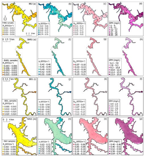 The OLI images were processed to retrieve at and bbp-(after removing water backscattering from bb) and sequentially the Kd. The M4 SPM retrieval model in Table 4 was applied to the Kd images, given that it provided the most reliable SPM estimations at Kd(655) nm band. The SPM distribution maps over different reservoirs are shown in Figure 8. Values of Rrs(655) ranged between 0.011 and 0.018 sr−1 in BB2, 0.006 and 0.016 sr−1 in BAR1, 0.005 and 0.024 sr−1 in IBI1, and 0.002 and 0.010 sr−1 in NAV1. The at(655) values ranged between 0.63 and 0.76 m−1 in BB2, 0.42 and 0.60 m−1 in BAR1, 0.50 and 0.70 m−1 in IBI1, and 0.63 and 1.12 m−1 in NAV1. The bbp ranged between 0.11 and 0.22 m−1 in BB2, 0.07 and 0.21 in BAR1, 0.05 and 0.15 in IBI1 and 0.02 and 0.22 m−1 in NAV1, clearly showing a downstream decreasing trend overall, i.e., sequential trapping of SPM materials through the cascades. The SPM concentrations were higher in BB2, ranging from 5.0 to 25 mg.L−1. In BAR1, they ranged from 6.3 to 15.0 mg.L−1, and in NAV1, they ranged from 0.40 to 0.70 mg.L−1. SPM estimates retrieved 28.4% of nRMSE, on average.