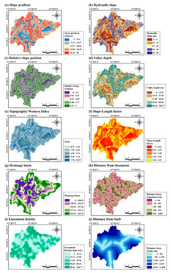 18 various topographical factors were used for GPP analysis, including terrain and surface data derived from remote sensing images. (Figure 2). The selected factors were slope gradient, relative slope position, plan curvature, hydrogeology, hydraulic slope, distance from faults, distance from lineament, depth of groundwater, distance from channel network, lineament density, valley depth, Topographic Wetness Index (TWI), slope length (LS) factor, drainage basin, Terrain Ruggedness Index (TRI), convergence index, land-cover, and soil texture. The spatial database of these factors was reproduced using the ArcGIS software with SAGA-GIS.