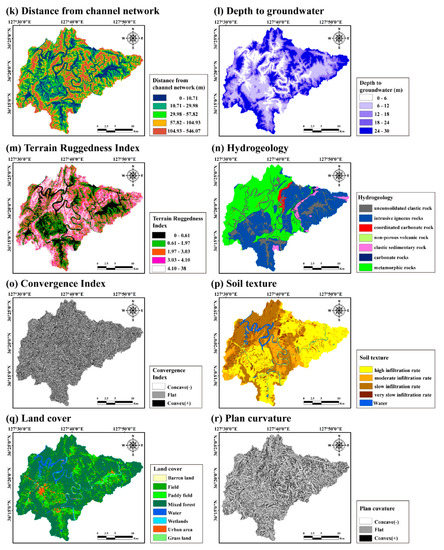 The digital elevation model (DEM) was generated from a topographic map with a resolution of 30 m using a 1:5000 digital topographic map from the National Geographic Information Institute (NGII). The slope gradient, plan curvature, relative slope position, valley depth, LS factor, convergence index, drainage basin, TWI, and TRI were calculated using the DEM [54]. Also, various thematic maps such as those depicting soil texture, land cover, and hydrogeology were resampling at 30 m resolution and used in this study [11].