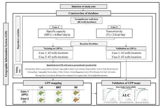 The GPP mapping process is shown in Figure 3. A total of 84 groundwater wells were split: 50% were randomly demarcated as training data and the other 50% were retained as validation data. A total of 18 hydrogeology-related factors were combined into a spatial database. Then, the selected T and SPC data (T values ≥ 2.61 m2/day and SPC values ≥ 4.88 m3/day/m) were used to train the three models. Finally, the results of GPP maps was verified using Area-Under-the-Curve (AUC) analysis.