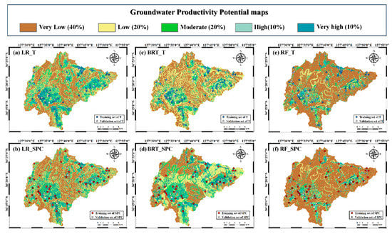 Table 4 shows the importance of the values of each predictor variable in the BRT and RF models. The data in the table also explain the correlation between GPP and the related factors. The predictor importance ranges between 0 and 1. It indicates a factor near 1 that can be said to be closely related to the presence of groundwater. As shown in Table 4, the most important variable affecting groundwater productivity (both T and SPC values) when applying the BRT and RF models is land cover. Conversely, the least influential variable in the case of both models is plan curvature.