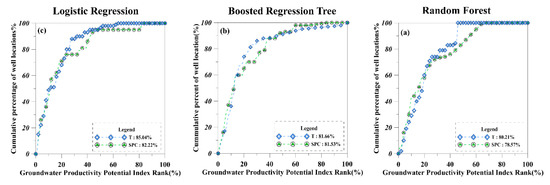 The next step was to validate the GPP maps created using the BRT, RF, and LR models. The prediction rate of the validations was determined by comparing the GPP maps created using the RF, LR, and BRT models with the remaining 50% of groundwater wells data not used in the training set. A GPP rank with more than 10% value could explain the presence of 30% of the groundwater wells and rank with more than 60% value could explain 90% of the groundwater wells identified by the three models.