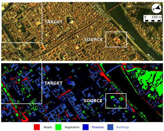 False color composite image, reference data and label meaning for the Pavia City dataset. Please note that the target and source domains are parts of the same image.