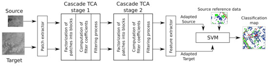 Figure 3 shows a block diagram of the proposed scheme. After a first step where a set of patches are extracted from samples of the different images, two sequential cascade stages composed by a filtering process, a factorization of patches into blocks, and the computation of filter coefficients are applied to perform the DA task. In each cascade stage, TCA is applied to compute the transfer components needed to build the TCA filters that are used to perform the convolutional operation over all the previously extracted patches. The TCA filters are computed for each stage based on the output of the previous stage. Finally, a feature extraction step is carried out. This stage is responsible for producing the new features generated by the network. As a result a new representation of the samples is obtained. Once the images belong to the same domain, a classification process using Support Vector Machine (SVM) is performed. The different steps involved in the proposed scheme are explained along the next sections.