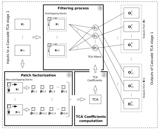 TCANet requires, as a standard CNN, different layers. In this paper two layers are considered. Each one of these layers is called a cascade TCA stage as it is shown in Figure 3. Each stage calculates the coefficients corresponding to the TCA filters from the patches provided by the previous stage. A general scheme of the cascade TCA stage 1 is shown in Figure 5. Three steps, each one marked with its corresponding execution position, can be identified: factorization of the patches into blocks, calculation of the filter coefficients, and filtering process. An identical structure is used for the cascade TCA stage 2 where the input data is the output of the cascade TCA stage 1. Any new stage would have the same structure.