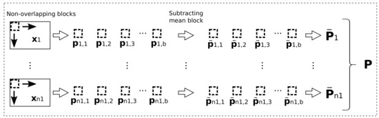 Unlike in [24] where overlapping blocks are extracted from each patch, TCANet extracts only non overlapping ones. This optimization highly reduces the amount of memory required and the computational cost. For each patch that was obtained in the feature extraction process, b blocks of size are extracted. Once all the blocks of have been extracted, the block mean of this patch is subtracted from all of them obtaining , where is a mean-removed block. Figure 6 gives a graphical overview of the process. After applying the same process to all the original patches we get