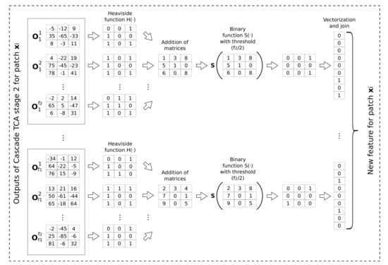 The number of outputs for each initial input patch produced by the last cascade TCA stage is (first column in Figure 7). Once all the outputs of the last stage have been computed, they are binarized using the Heaviside function . This function returns 0 when the value is less or equal than 0 and 1 otherwise. After that, the outputs containing only binary values are grouped into sets of elements. Finally, these elements are reduced by adding all the values component by component (denoted as addition of matrices in the figure), considering all the patches in the images the result of the reduction will be: