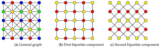 A graph (a) is decomposed into bipartite components (b) and (c). Node colors are the result of the graph coloring process, required for the graph bipartition.