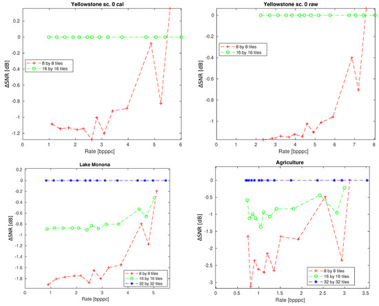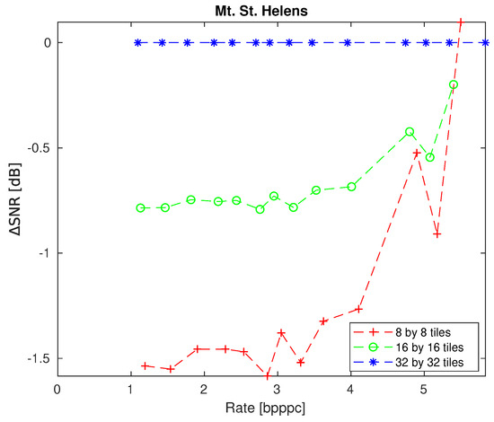 In order to alleviate the time complexity from the TERM factorization, we developed a divide and conquer method. We initially split the component that is used to derive the graph wavelet transform into multiple small square tiles. From each tile, we compute its corresponding GraphBior transform to which we apply the TERM factorization. For the selection of a suitable tile size, in this subsection we study the effect on the performance of our compression scheme with respect to the tile size. Therefore we have experimented with IGB on our compression scheme, with no spectral transforms and using 3 different tile sizes (8 by 8, 16 by 16 and 32 by 32 square tile sizes). We tested the performance of IGB on the hyperspectral images, listed in Table 1, that contain several hyperspectral scenes available at the CCSDS website [36]. In Table 2 we display the entropy, in bits per pixels per component (bpppc), at which IGB becomes lossless, while using . We observe that the entropy where the IGB transform becomes lossless decreases as the tile size increases. This first observation encourages us to use a larger tiles for the lossless case. The results from Figure 4 lead to the same conclusions when testing the lossy performance of IGB. Specifically, in Figure 4 we display the performances of IGB when using tiles of 8 by 8 and 16 by 16 pixels, relative to using larger tiles of 32 by 32 pixels. Larger tile sizes are not included in our experiments as we are limited by the high computational complexity of the TERM decomposition. In Figure 5 we have repeated the same experiment on other hyperspectral images. Regarding the two AVIRIS images, due to their much larger spectral size, we have not experimented with the largest tile option as we have done with the Landsat image. The experimental conclusions also agree with our intuitive interpretation of the graph biorthogonal filterbanks since when using larger tiles, the graph can exploit spatial redundancies on a bigger area of each component. This is because the graph edges that connect adjacent nodes that belong to different tiles are not utilized. Since the number of discarded edges rises as the tiles becomes smaller so does the performance of IGB deteriorate. Therefore it is beneficial to keep the sizes of the tiles as large as possible but small enough to allow a fast TERM factorization. Luckily this solution can be parallelized since we could process every tile of every component of the same group at the same time.