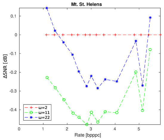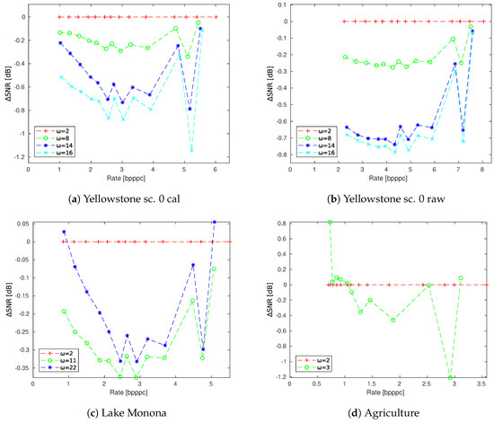In Figure 6 the relative rate-distortion plot displays the decrease of performance when larger values of are compared against the smallest . One can clearly conclude that it is beneficial to choose smaller values of the parameter when no spectral transform is used. We repeat the experiment with several other hyperspectral images and display the results in Figure 7. Specifically, it is for that tends to lead to optimal results in all cases. This result agrees with our expectations since components closer in the spectral dimension tend to have high correlation. Thus, the component that has been used to create the IGB transform will capture sometimes more accurately the spatial redundancies of its neighboring component rather than of one located further away in the spectral dimension. Though this can lead to detrimental results for low values, when high quantization occurs. As we can see from Figure 6 and Figure 7c,d at low rates, larger parameters outperform lower ones.