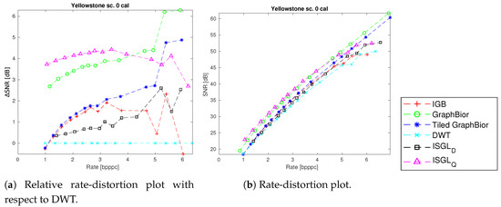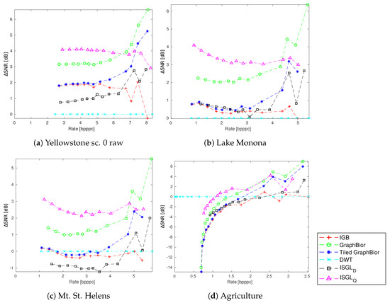 For this experiment, the rate-distortion plot, as well as the relative rate-distortion plot using the DWT transform as reference can be observed in Figure 8a,b respectively. From the rate-distortion plots of Figure 8 we observe that the ISGLQ performs the best for low and medium rates, whereas GraphBior provides the best results for high rates. It is important to mention, though, that in most cases IGB slightly outperforms the DWT as well as the ISGLD at low rates. Moreover, although in general, tiled GraphBior outperforms IGB, at low rates, both perform similarly. This same behavior is also observed between classical discrete wavelet transforms and their reversible counterparts. Given the previous observation and since the results of IGB improve as the tile size increases, one could speculate that a IGB that does not use any tiles would perform similarly to GraphBior for low rates. This experiment has been repeated on different hyperspectral scenes and the results can be observed in Figure 9.