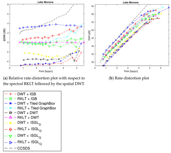 In Figure 10a,b we present the rate-distortion plot as well as the relative rate-distortion plot. The results are relative to applying a spectral RKLT along the entire hyperspectral image, followed by a spatial DWT.