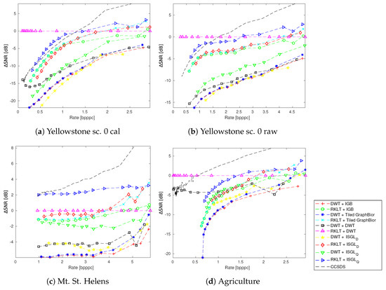Next we explore the version of the compression scheme where we include a spectral transform on each band group before applying the spatial transform. The graph transforms are always computed from the luminance values of components and not the spectrally transformed results. We experiment with the Reversible Karhunen Loeve Transform (RKLT) [42] and DWT as spectral transforms. The spatial transforms compared in this experiment are the proposed IGB, the tiled GraphBior, the DWT, the ISGLQ and ISGLD. In this final experiment, we also include a comparison of our overall compression scheme with the CCSDS-123.0-B-2 standard, tuned according to Reference [19].
