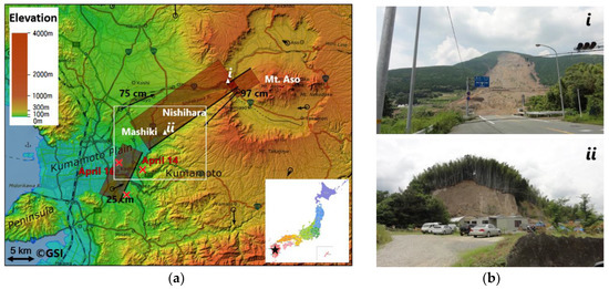An Mw 6.2 earthquake hit the Kumamoto Prefecture in Kyushu Island, Japan, on 14 April 2016, at 21:26 (JST). The epicenter was located in the Hinagu fault with a shallow depth. Twenty-eight hours later, another Mw 7.0 earthquake occurred in the Futagawa fault on April 16 at 01:25 (JST), close to the Hinagu fault. The first event was called a “foreshock” and the second one the “main shock”. Figure 1a shows the locations of these causative faults and the Japanese national GNSS Earth Observation Network System (GEONET) stations in the source area [1]. 75-cm horizontal movements to the east-northeast were observed at the Kumamoto station, while 97-cm horizontal movements to the southwest were recorded at the Choyo station during the main shock. Strong shaking, level 7 on the Japan Meteorological Agency (JMA) seismic intensity scale was observed in Mashiki Town in both the foreshock and the main shock events. A total of fifty-five people died in the earthquake sequence, mostly due to the collapse of wooden houses in Mashiki town and landslides in Minami-Aso village. 8673 buildings collapsed, and approximately 35,000 buildings were severely damaged [2]. The earthquake also caused the interruption of lifelines, e.g., gas, electric power and water. Road and railway networks were affected by landslides and surface ruptures, making it difficult to access the affected area soon after the earthquake.