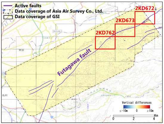 Our study area is located at the boundary of Mashiki town and Nishihara village, along the Futagawa fault. The study area is shown in Figure 2 by three red frames. Their identified IDs are 2KD672, 2KD673 and 2KD762. Each frame covered an area of 2 km × 1.5 km. According to the previous study [17], more than 2-m right-lateral strike-slip and 2-m subsides were detected on the west side of the fault in this area. Due to these large crustal movements, many small landslides and numerous surface ruptures occurred.