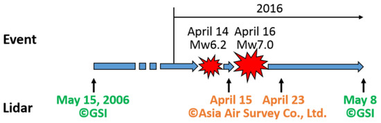 Timeline of the 2016 Kumamoto earthquake event and the used Lidar data.