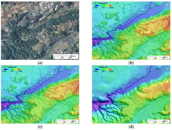 The aerial photo and the transformed raster images of Lidar data in grid 2KD673: (a) The ortho-image on 15 April 2016, with 16-cm spacing; (b) the DSM image with 1-m spacing acquired on 15 April 2016; (c,d) the DSM and processed DTM images with 2-m spacing acquired on 15 May 2006.