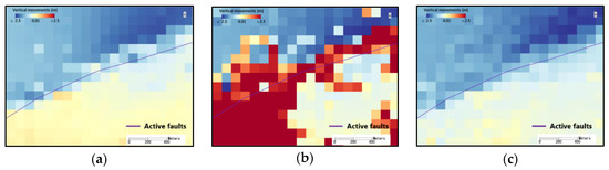 The estimated vertical coseismic displacements using averaged vertical differences in a 100 m2 window: (a) The result of DSMs on 15 and 23 April 2016; (b,c) the result of the DSMs and DTMs acquired on 15 May 2006, and 8 May 2016.