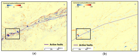 Vertical differences between the pre- and post-event Lidar data after removing the coseismic displacements: (a) Subtracting the DSM on 23 April 2016, from that on 15 April 2016; (b) subtracting the DTM on 8 May 2016, from that on 15 May 2006.