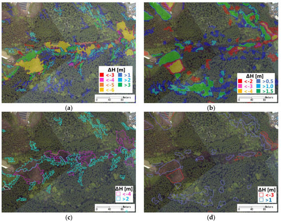 An enlarged area within the black frame in Figure 6 is shown in Figure 8. The extracted regions by the different threshold values are overlapping on the ortho-image on 23 April 2016 (Figure 8a,b). There were two large landslides in this area, which were also identified by both NIED and GSI. Those two landslides could be completely detected from the DSMs, even using the strictest threshold value (−6 m). The threshold value of −3 m extracted several tree changes. Thus, we used −4 m as the best threshold value. In the DTM results, the shapes of the two landslides could not be extracted completely when the threshold value was set as −4 m. Furthermore, the threshold value of −2 m extracted many non-landslide regions. The threshold value was determined to be −3 m for the DTMs. For the depositions, the threshold value of 1 m for the DSMs and 0.5 m for the DTMs extracted much noise. The threshold value of 3 m for the DSMs and 1.5 m for the DTMs could not completely extract the landslides. Thus, the threshold values were determined to be 2 m for the DSMs and 1.0 m for the DTMs. The extracted increased or decreased pixels were grouped into objects. If the size of an object was smaller than 100 m2, it was removed as noise.