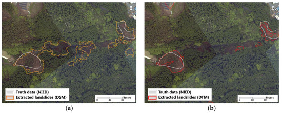 The modified results are shown in Figure 9. From the DSMs, five landslides were extracted. The extracted regions of two landslides were increased by merging the depositions. Four landslides were extracted from the DTMs. The traced landslide regions by NIED are also shown in Figure 9 by the white lines. For the two recognizable landslides, the shapes matched the regions traced by NIED. The confusion matrixes were calculated in this area, using the polygon traced by NIED as the truth data. They are shown in Table 1. The producer accuracy of the DSM results was 87% and the user accuracy was 32%. Since many felled trees were extracted wrongly as landslides, the user accuracy was low. The producer accuracy of the DTM results was 77%, and the user accuracy was 56%. Compared to the DSM results, the commission errors reduced significantly. In both the results, the high producer accuracies showed the potential of the proposed method for detecting landslides. The landslides dominated only 10% of the area, thus, both the overall accuracies were over 90%. The kappa coefficient was 0.44 for the DSM results and 0.63 for the DTM results.