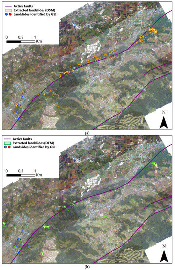 The locations of landslides investigated by GSI using the aerial photos taken in April 2016, are also shown in Figure 10. In the target area, 13 small landslides (larger than 0.005 km2) and one large landslide (larger than 0.01 km2) were indicated. Comparing with the DSM results, 11 out of 14 landslides were successfully detected. The three omitted locations were landslides that occurred after the foreshock, which was confirmed from the aerial photo. An example of two omitted locations is shown in Figure 12a. In the aerial photo taken on 15 April 2016, these two landslides had occurred. This means our results using the pre- and post- main-shock DSMs detected all the landslides caused by the main shock. Comparing with the DTM results, 10 out of 14 landslides were successfully detected. Three of the omissions showed only height increases on the post-event DTMs. Without a neighboring erosion, the depositions were not identified as landslides. Thus, they could not be detected in our results. One omission showed that the height decreased; however, the area that decreased more than 3-m was less than 100 m2. Those errors may be caused by the low point density of the pre-event Lidar data. The producer accuracy and user accuracy of our results counted by number is summarized in Table 2. The low user accuracy of the DSM results was mainly caused by the felled trees due to surface ruptures or soil movements, which can be partially observed in Figure 9a. Some commission errors in the DTM results were caused by changes in land use during the 10-year period. The low point density of the data in 2006 was also a main cause of commission errors.