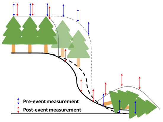 The proposed approach and the defined threshold values were applied to the entire target area in grids 2KD 672, 2KD673 and 2KD762. The obtained results are shown in Figure 10. From the DSMs acquired on April 15 and 23, 2016, 110 regions were detected to be landslides. Most of the extracted results were located close to the Futagawa fault. The total area of the detected landslides was 0.097 km2, including 0.066-km2 erosions and 0.031-km2 depositions. The volume of the results was also calculated. The decreased volume was 8.1 × 105-m3 and the increased volume was 1.7 × 105-m3. The increased volume was 20% of the decreased one. The DSMs measure the heights at the top of trees. When a landslide occurred, the trees on the slope fell and slid with soils to the ground. The decreased volume included the space of the standing tress, whereas the increase volume included the felled trees. Thus, the decreased volume was much larger than the increased volume. A concept image of this phenomenon is shown in Figure 11.