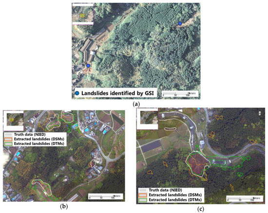 Three enlarged areas for comparisons: (a) The locations of the two landslides that occurred before the main shock, overlapping the 15 April 2016, aerial photo; (b,c) comparisons of the detected landslide regions and the landslides traced by NIED, where the background is the 23 April 2016, aerial photo.