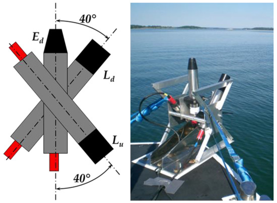 R(λ) were calculated from measurements from the above water TriOS-RAMSES hyperspectral radiometers following the protocol of REVAMP [21]. The TriOS-RAMSES system (Ramses) was composed of two RAMSES ARC hyperspectral radiance sensors measuring upwelling radiance (Lu(λ)) and downwelling radiance (Ld(λ)) in the same azimuthal plane, and one RAMSES ACC irradiance sensor measuring downwelling irradiance (Ed(0+,λ)). The measured spectral range was 350–900 nm. The radiometers were installed in a common frame, as shown in Figure 1, and nadir/zenith angles of 40° were fixed in the frame. The recording interval was once per 10 second interval. The solar azimuth angle was adjusted manually during measurements and was kept between 90° and 180° while avoiding shadows from the vessel.