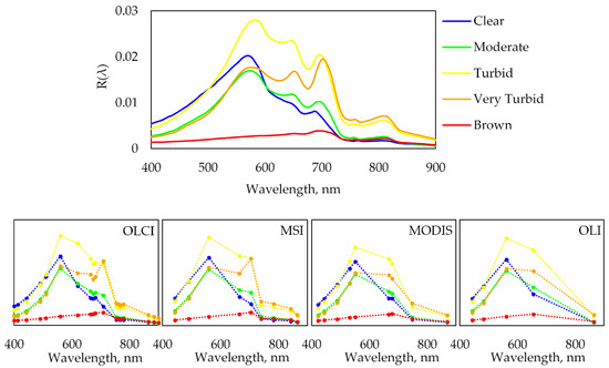 R(λ) for each OWT (top) and R(λ) by OLCI, MSI, MODIS, and OLI bands calculated with sensor-specific SRFs (bottom).