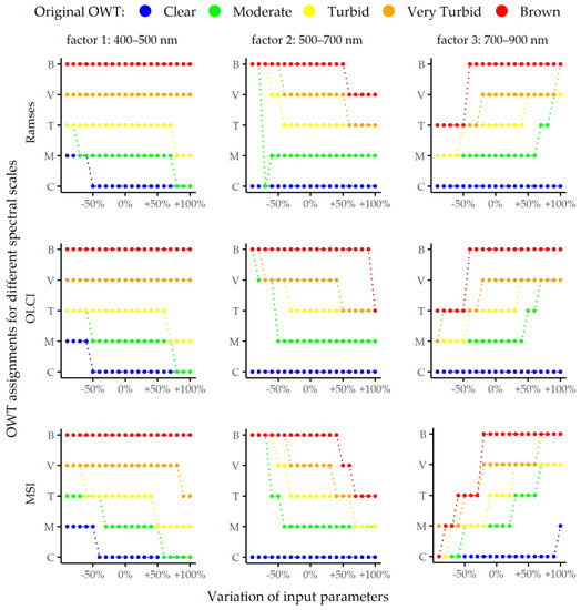 The sensitivity of the determination of OWTs was influenced differently by the OWT, sensor type, and spectral range. Figure 3 shows a detailed local sensitivity analysis of the OWT results. The Clear OWT was most sensitive to a decrease of local sensitivity factor 1 parameter (R(λ) values in the wavelength range of 400–500 nm). A decrease of factor 1 input values by more than 40% (i.e., changing the R(λ) values in the wavelength range of 400–500 nm by more than 40%) caused the OWT to change to Moderate. The Moderate OWT was sensitive to sensor type and wavelength range. A decrease of factor 1 and factor 2 (R(λ) values in the wavelength range of 500–700 nm) could cause the spectra to be classified as Turbid, Very Turbid, or Brown. Additionally, the Moderate OWT was sensitive to both increases and decreases in factor 3 (R(λ) values in the wavelength range of 700–900 nm). Regarding sensor type, for Ramses, a change of input parameter values of more than 60% was required to output a different OWT, while a change of just 20% was required for MSI. The Turbid OWT was the most sensitive to changes in factor 3. A decrease of factor 3 (e.g., 10% for MSI) changes the OWT to Moderate, while an increase of factor 3 changed the OWT into Very Turbid. Additionally, decreases of factor 1 or factor 2 of more than 30% shifted the classification to a Very Turbid or Brown OWT. The Very Turbid OWT was less sensitive to changes in the blue part of the spectrum and most sensitive to changes in the red part of the spectrum. Decreases in factor 3 changed the OWT to Turbid or Moderate. Increases in factor 2 caused spectra to be classified as Turbid, while decreases in factor 2 caused spectra to be classified as Brown. The Brown OWT was sensitive to increases of factor 2 and decreases of factor 3. Changes of factor 1 had a minimal impact on the classification of the Brown OWT.