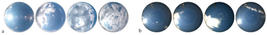 Changing cloud condition during the R(λ) measurements captured by all sky camera in stations with (a) big and (b) small variability of R(λ). Four images cover a time gap of approximately 20 minutes.