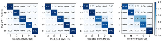 Normalized confusion matrices showing the accuracy of OWT assignment using in situ measurements of R(λ) convoluted into the OLCI, MSI, MODIS, and OLI bands. Rows show the true OWTs determined from in situ measurements of R(λ) using Ramses, and columns show the predicted OWTs determined from the convoluted R(λ). The diagonal elements represent the situation where the predicted OWT is the same as the true OWT (i.e., correct classification).