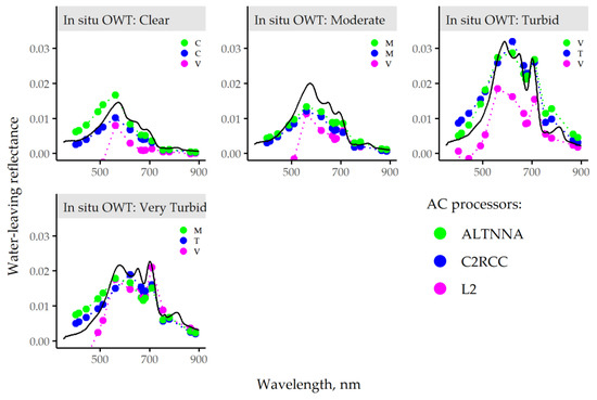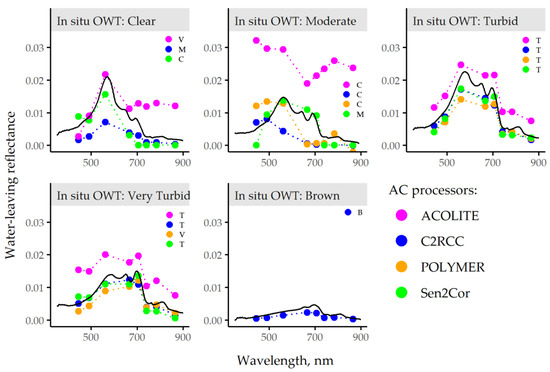 Examples of OWT determined using in situ measurements of R(λ) (black line) and OWT estimated from MSI images processed with different AC processors, namely ACOLITE, C2RCC, POLYMER, and Sen2Cor.