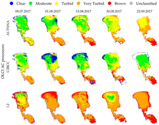 Examples of OWTs obtained from OLCI images of Lake Peipsi acquired in July–September 2017 processed with the ALTNNA, C2RCC, and L2 AC processors.