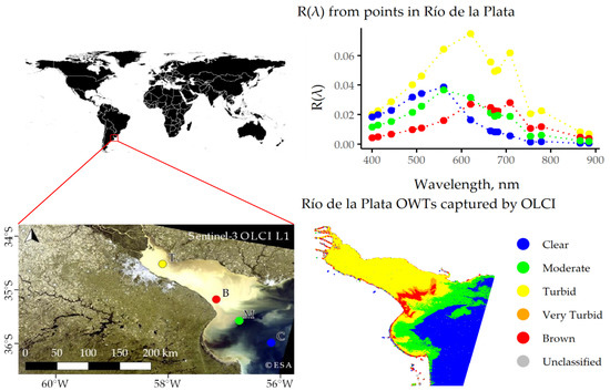 Estimation of R(λ) and classification of OWTs from OLCI images of Río de la Plata (the La Plata River; South America) acquired on 01 May 2017 processed with the C2RCC AC processor.
